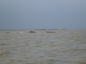 I don’t think I need to point out that this is not good for oystercatchers. Past experience has taught me that anytime the wind gets about 20 mph the oystercatchers are in trouble so I was afraid of what we’d find when we headed out. Right off the bat, we found that a pair in Jones Bay that had had small chicks now had none. John and his wife Lynn had been watching this island from their house on Tiki Island and they saw that it had gone nearly underwater so they knew the prognosis was not good for this pair. As you can see there wasn’t much of the island above water.