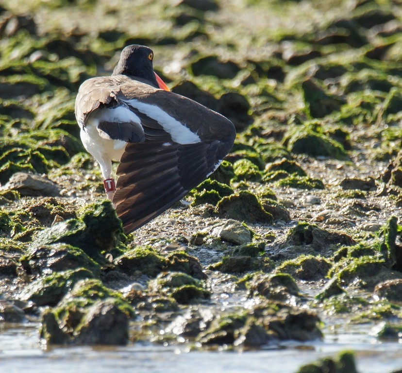 Ha! We know you have a secret! We decided the other nest had failed and in fact we may have determined the owners of it incorrectly. We trapped LT on the nest so we know it was his but we thought his mate was KR. Today JA was hanging out with LT and KR was hanging out with the unbanded bird that we thought was JA’s mate. Did they switch or did we get it wrong? No telling! The soap opera continues in the oystercatcher world. LT was doing a little yoga.