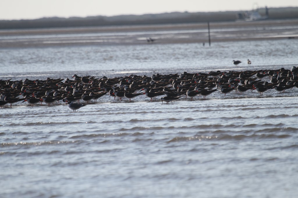 On Wednesday Robin and I went out to East Matagorda Bay. We weren’t able to get out there last week so I was anxious to see what had happened to the nests there. It was a beautiful day with only a little wind. I would have preferred it to be about 10 degrees warmer though! On the way out we found a huge flock of Black Skimmers so we had to stop and gawk at them a bit.