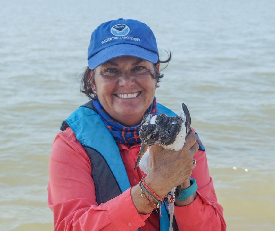 On Wednesday I was joined by Alan Wilde, Maureen Nolan-Wilde (Alan’s wife, big GCBO supporter, and turtle expert) and Steve Alexander (Texas A&M Galveston for the West Galveston Bay survey. We had three sets of chicks to band and I wanted to get that out of the way in the morning so I didn’t have to worry about it all day so instead of going to Swan Lake first, we did the route the other way around and started in Jones Bay. FR was not present on his ever shrinking island but we found LU there feasting away on oysters. LU was banded as a chick in July 2017 on Jigsaw Island in West Galveston Bay so he/she isn’t far from home. Next year he/she will be old enough to breed so we’ll have to see if he/she was just passing through or is there to stay.