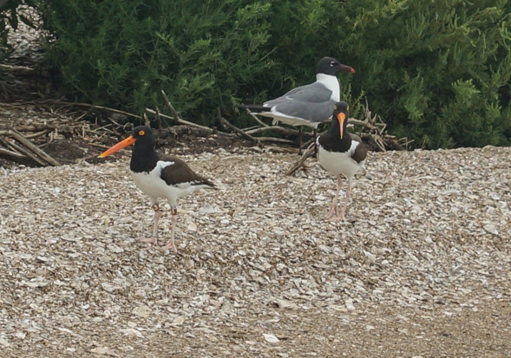 We checked on the final pair on North Deer but they weren’t present so I guess their nest failed too. Then we went down the GIWW to check on ET & A8A. Alan and I had both figured their nest must have overwashed since it was basically on a reef. We saw some pelicans standing where it had been and no sign of the oystercatchers. We found them farther down on a reef. Not surprising their nest failed with the tide as high as it has been.