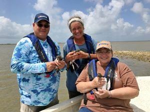 On Friday I headed out to East Matagorda Bay with GCBO Avian Biologist Robin Bjork and GCBO volunteers Keith and Robin Wise. Keith helped me pick out the boat and so it was good to be able to get him out on it. There were four sets of chicks that needed banding but three of them needed banding while I was on vacation last week. I had planned a special trip out this past Monday to band those but the weather was bad Monday and we couldn’t go out. I was hoping maybe we could still catch a few of them.