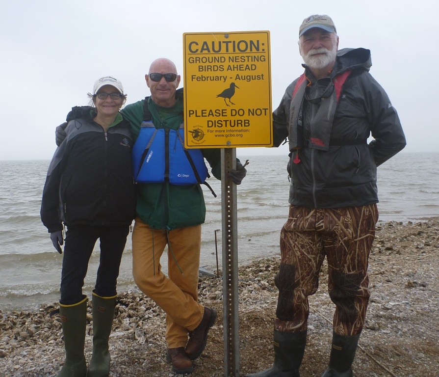We headed down the GIWW to Old Gulf Cut and found that 25 & unbanded were also not at home. 17 & unbanded were but they had no nest. This pair nests early every year so it surprised me that they didn’t have one. Perhaps they did and it got overwashed. We’ll never know. The fog had cleared up a lot so we headed across the bay to the Oyster Farm. We found an unbanded pair on a reef there but neither of the pairs that nest there so we did some sign repair there too. When we went back to where the unbanded pair was to make a trapping attempt they had vanished. Pooh.