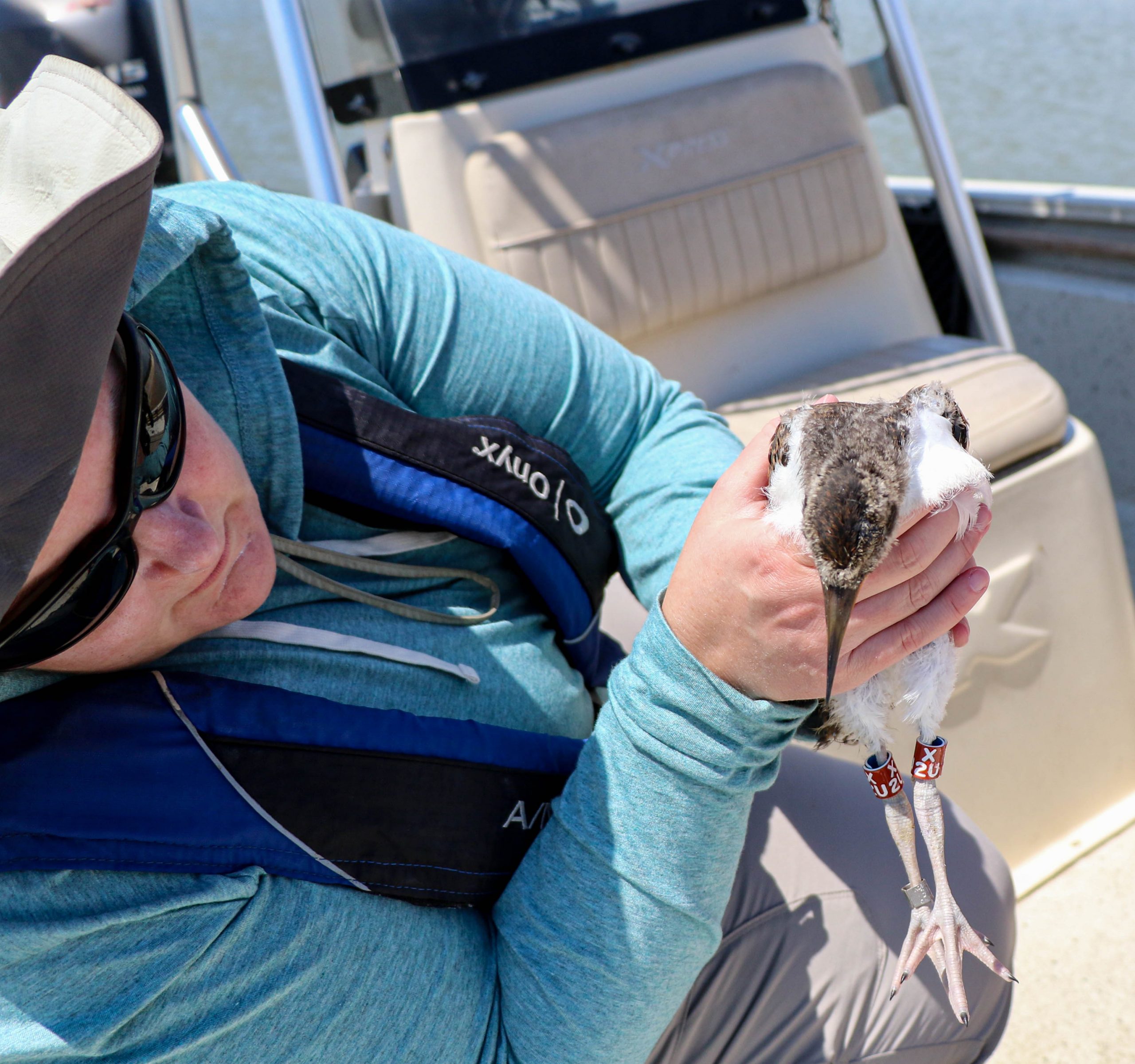 Doesn’t that look like a bird on a nest? Ugh. We pulled the boat up to a bulkhead and I went to check. No nest thankfully. It would never make it there. We motored back around the island to try to get a photo of the unbanded pair’s chick and Alan caught a shot of it running up into the skimmers.