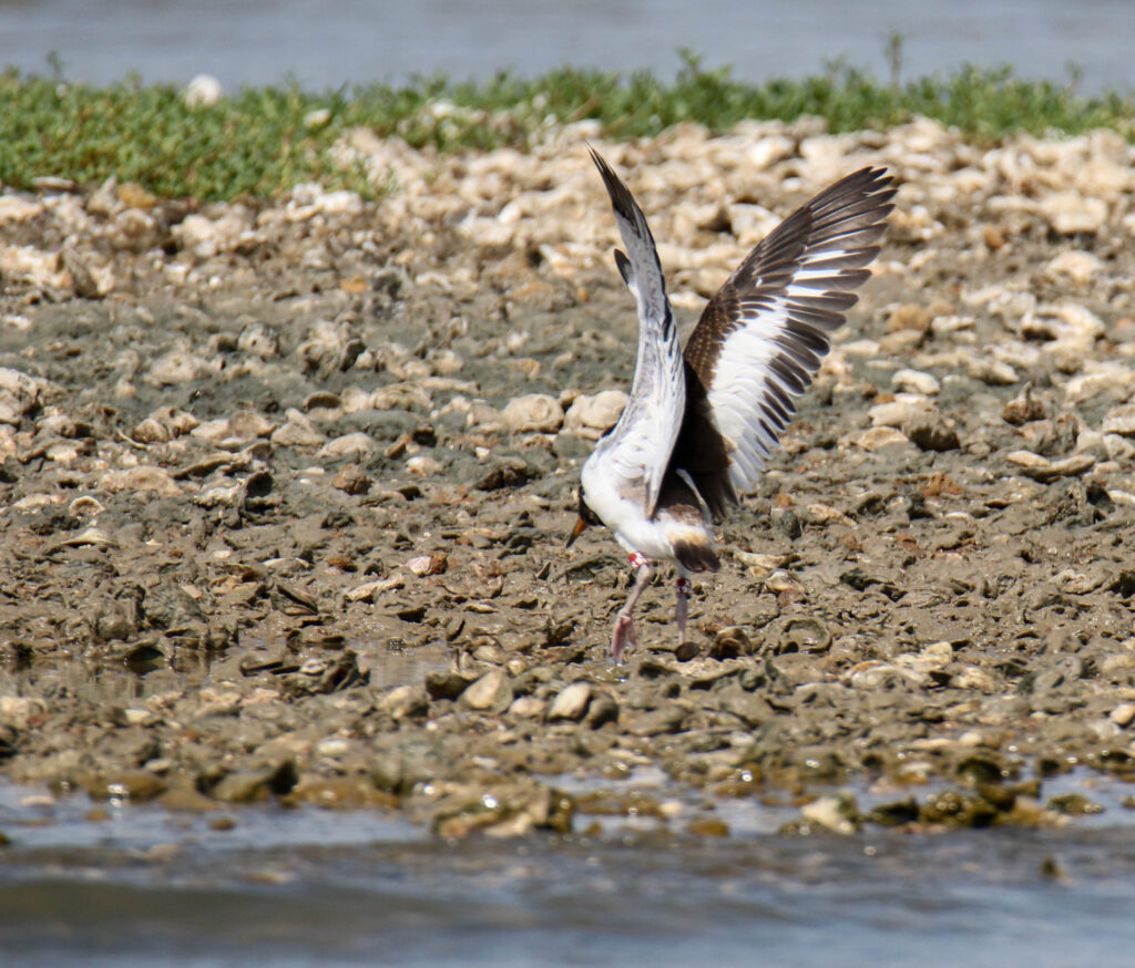 They were joined by a third bird in the air and all three landed on the shoreline. When we approached I could see that it was 11 & unbanded with one chick! Woohoo! X5X made it. That was VERY exciting. 11 hasn’t fledged a chick since 2013. So long ago that he had a different mate than he does now. The island he used to nest on has eroded away to reef and now he can only nest along a mainland shoreline that is rife with coyotes. His mate now is unbanded, so we don’t know if it’s the same female from year to year but it was so good to see they were successful this year.