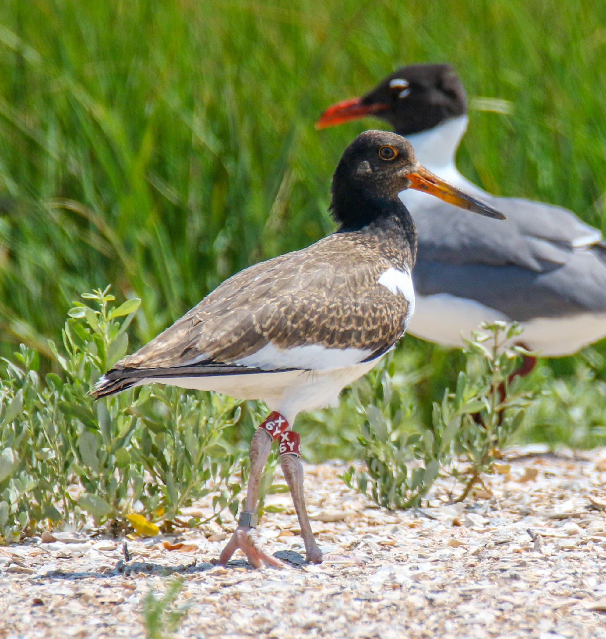 We headed over to run the shore of Galveston Island. YK & unbanded were not home. There were eight oystercatchers at 8 Mile Road and only one on the docks. At Gangs Bayou, C8A & unbanded weren’t home. A4A & unbanded and their chick were standing off to the side of the Black Skimmer and Gull-billed Tern colony. I think we found where the Struve skimmers went! The adults flew when we moved in and the chick went with them. Fledged!