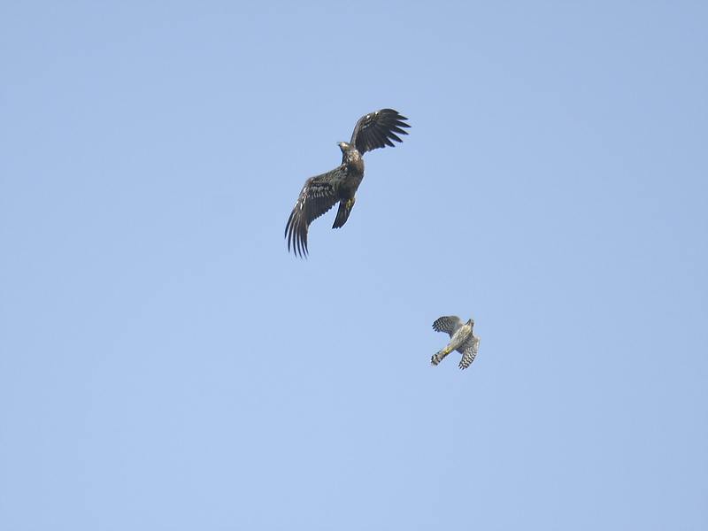 Bob reports 6 migrating raptors today. Northern Harrier 1 Sharp-shinned Hawk 4 Bald Eagle 1 The wind was moderate from the SE and there were nice clouds but the birds did not come. Six Red-breasted Mergansers, a feeding flock of about 2,000 cormorants and a dolphin out in the bay kept Bob entertained.